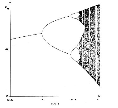 O diagrama da figura 1, conhecido pelo nome de bifurcação, mostra o que acabámos de dizer. Este diagrama pode ser obtido da seguinte maneira : Escolhe-se um qualquer valor entre 0 e 1 para 'PN' e um valor concreto para 'r' que constitui o valor a analisar. Seguidamente, resolve-se a equação obtendo um determinado PN+1, que será de seguida usado como sendo PN, repetindo-se esta operação,digamos 200 vezes, por forma a eliminar os valores transientes. Agora, para um determinado valor de r, nas abcissas, marquem-se os sucessivos valores que PN irá tomar, nas ordenadas, para as seguintes, digamos, 300 iterações.